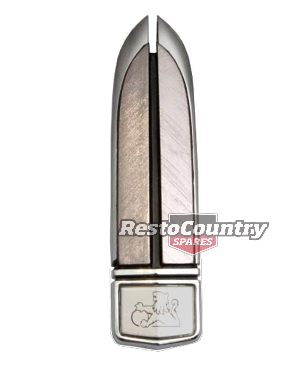 “Emblem CALAIS” (Name plate/emblem/lion) silver with black inlay badge which goes on the front panel (nose cone) on a VL and guard (fender) on a VK above the Calais badge and on the the bonnet (Hood) of a VN, this is a peel and stick type badge.